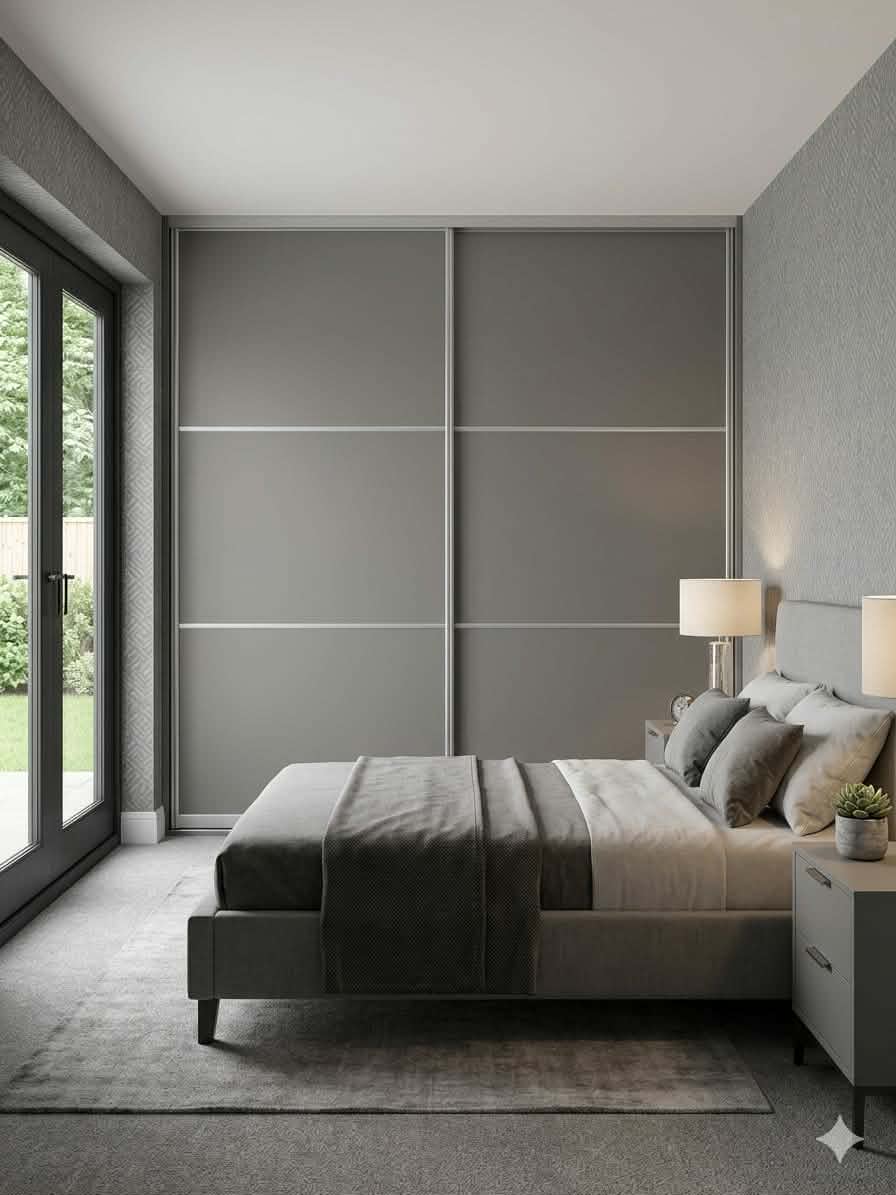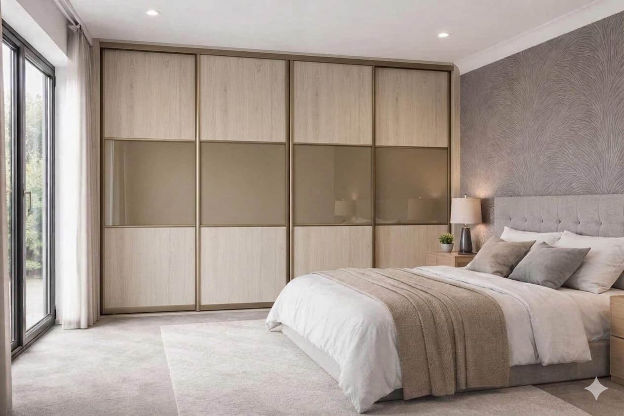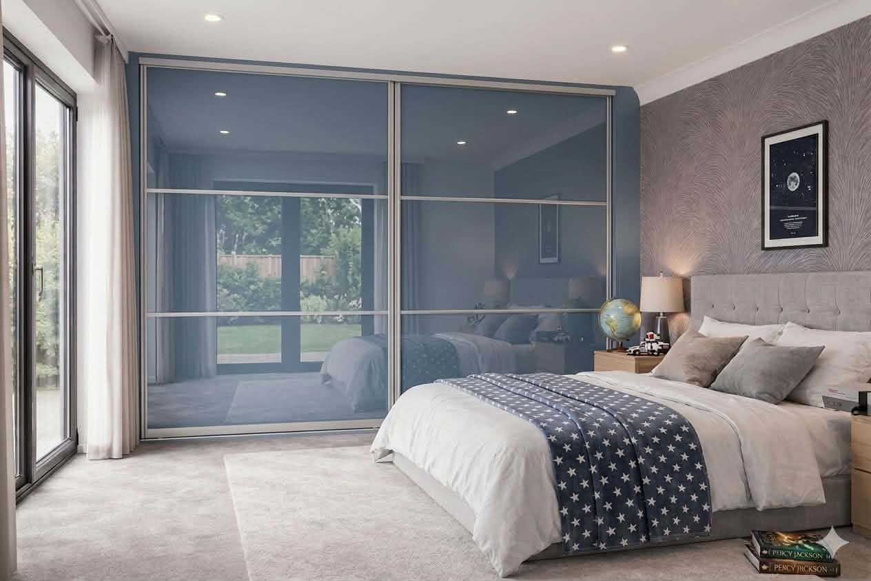 Our Beijing collection features a equal split panel design with multiple pieces of glass, mirror or melamine per sliding door. Or even a combination of all!